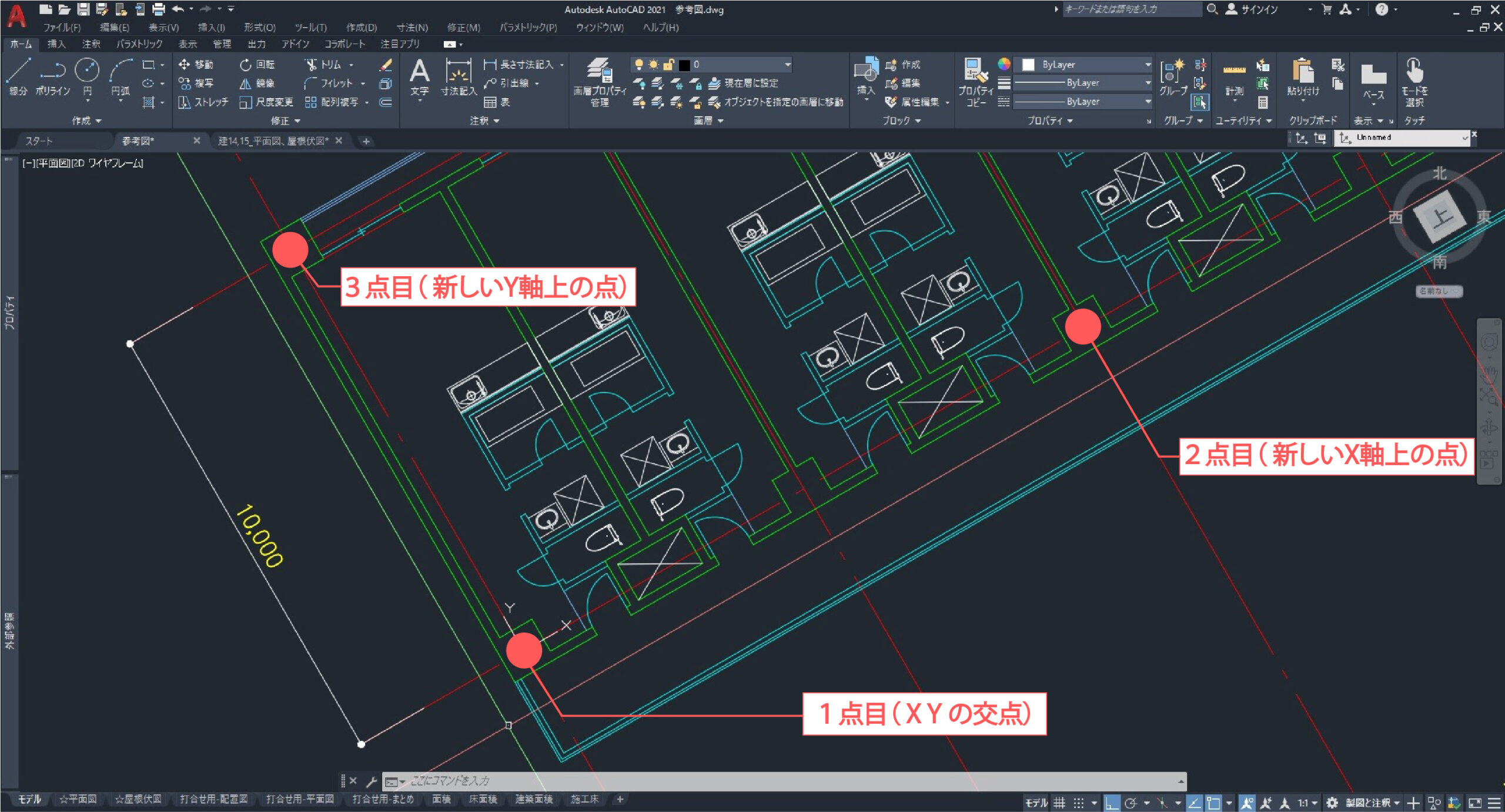 と表示されるので新しく定義したいXY軸の交点を指定(下図1点目参照)