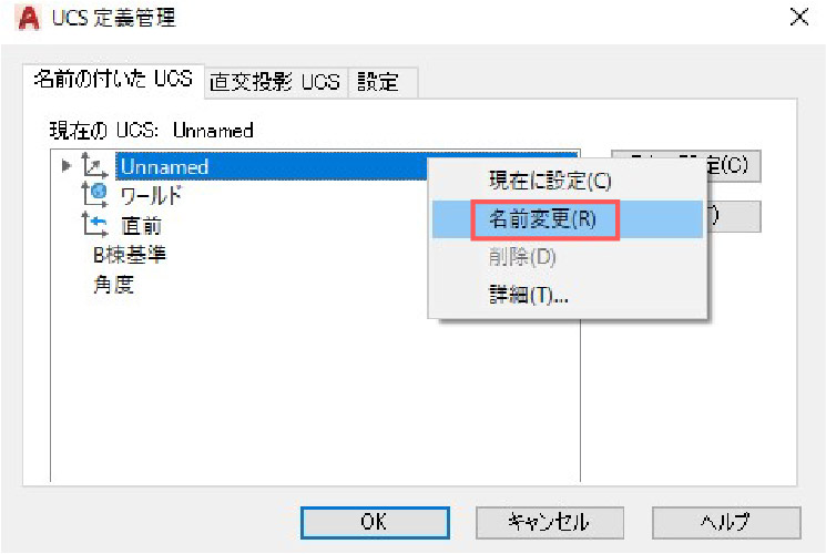 2.名前の付いた UCSのタブの中の『Unnamed』の部分を選択