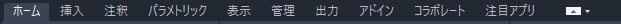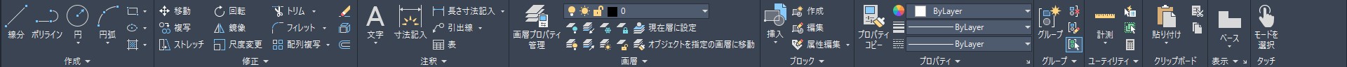 リボンとは図面を作成するにあたり必要となる各種カテゴリのコマンドが格納されています。タブに関連したコマンドを選択・実行を行うことができます。